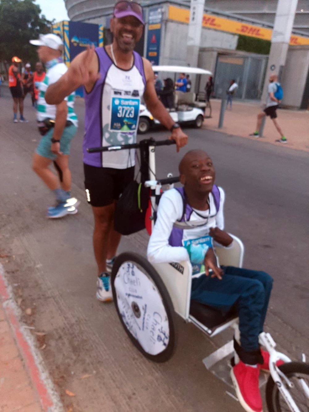 05:00 – I was busy setting up our jogger. First I must dismantle the jogger completely so that everyone can fit comfortably in my vehicle. In doing this I accidently snapped the brakes, so for 42,2km we were without brakes and the jogger’s alignment was out a bit and pulled to the left (minor challenge)! It’s like running when you have slight friction from your running socks. We posed for team photos and interviews and prepared Kudzai’s first meal for the day. He finished eating around 05:50 and we realized that we had to rush to our seeding pen as it closed at 06:05. Warm-up done and dusted.